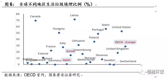 在城市人口密度與中國較為接近的韓國、日本、德國、英國等國家,垃圾焚燒+資源回收方式幾乎占據(jù)處置規(guī)模的80%,填埋率均低于20%。其中日本焚燒比例達(dá)77%,歐洲垃圾焚燒占比加權(quán)平均值約27%。