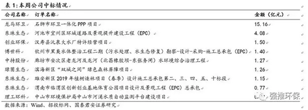 根據(jù)公告與招投標(biāo)信息統(tǒng)計(jì),本周環(huán)保公司中新增訂單9單、中標(biāo)總金27.28億;新增訂單前三名分別為龍馬環(huán)衛(wèi)、東珠生態(tài)和創(chuàng)業(yè)環(huán)保。