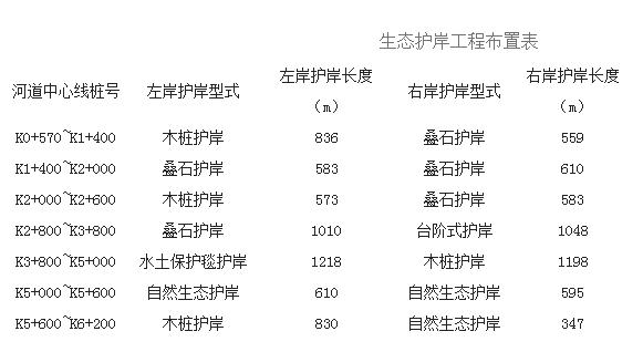 本次護(hù)岸采用以下幾種斷面形式,結(jié)合生態(tài)景觀的節(jié)點(diǎn)、營(yíng)造濱水景觀建設(shè)多樣性綜合考慮布置,本次生態(tài)護(hù)岸總長(zhǎng)10.6km,其中河道左岸建設(shè)護(hù)岸長(zhǎng)度5.66km,右岸建設(shè)護(hù)岸長(zhǎng)度為4.94km,各類型護(hù)岸長(zhǎng)度布置,詳見下表: