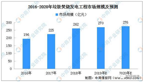 垃圾焚燒處理相較于衛(wèi)生填埋、堆肥等無害化處理方式具有處理效率高、減容效果好、資源可回收利用、對環(huán)境影響相對較小等優(yōu)勢,在國家政策的大力支持下,將成為垃圾處理行業(yè)的主流方式。在此背景下,垃圾焚燒發(fā)電行業(yè)快速發(fā)展,帶動產(chǎn)業(yè)鏈投資。2017年,我國垃圾焚燒發(fā)電工程市場規(guī)模超過200億元。隨著政策利好、城鎮(zhèn)化加快等因素影響,市場持續(xù)擴(kuò)大。2019年中國垃圾焚燒發(fā)電工程市場規(guī)模約為270億元,預(yù)計2020年將進(jìn)一步擴(kuò)大至276億元。