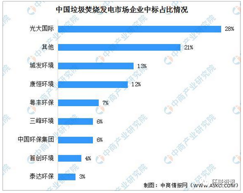 另外,從企業(yè)中標(biāo)情況來看,2019年我國垃圾焚燒發(fā)電市場中,企業(yè)中標(biāo)占比最大的為光大國際,占比達(dá)28%;其次為城發(fā)環(huán)境,占比為13%;康恒環(huán)境隨后,占比為12%。其中,據(jù)統(tǒng)計,光大國際中標(biāo)金額達(dá)到113.5億元,項目主要集中在廣東、山東、河北、安徽四地;城發(fā)環(huán)境中標(biāo)金額達(dá)到53.2億元,項目主要位于安徽;康恒環(huán)境中標(biāo)金額達(dá)到48.9億元,項目布局在山東、安徽、河北、江蘇等地。