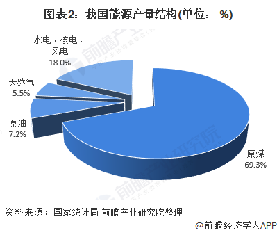 從我國(guó)能源生產(chǎn)結(jié)構(gòu)來(lái)看,2018年,原煤產(chǎn)量為26.13億噸標(biāo)準(zhǔn)煤,占比為69.30%,占據(jù)我國(guó)能源產(chǎn)量的主導(dǎo)地位;水電、核電、風(fēng)電的產(chǎn)量為6.79億噸標(biāo)準(zhǔn)煤,占比為18%。
