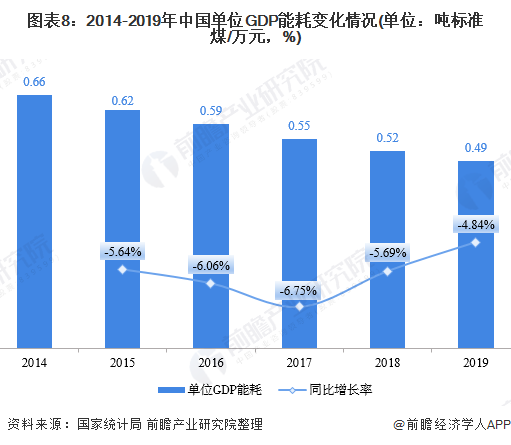 能源的利用效率可以從單位GDP能耗及相關(guān)系數(shù)上來(lái)體現(xiàn)。2014-2019年,我國(guó)單位GDP能耗逐年下降,意味著我國(guó)能源利用效率逐年增長(zhǎng)。2019年,我國(guó)每萬(wàn)元GDP消費(fèi)0.49噸標(biāo)準(zhǔn)煤,較2018年下降4.84%。