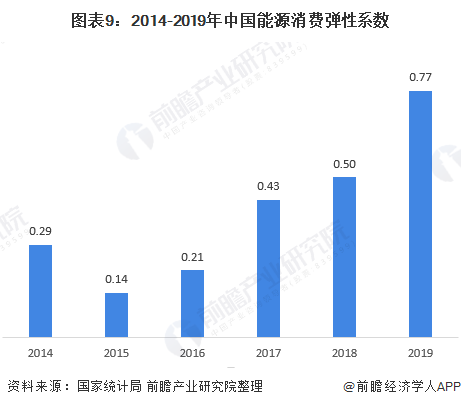 能源消費(fèi)彈性系數(shù)為能源消費(fèi)量年平均增長(zhǎng)速度與國(guó)民經(jīng)濟(jì)年平均增長(zhǎng)速度的比值,在一定程度上可以展示國(guó)民經(jīng)濟(jì)發(fā)展與能源消費(fèi)間的關(guān)系。2014-2019年,我國(guó)能源消費(fèi)彈性系數(shù)先下降后增長(zhǎng)。2019年,我國(guó)能源消費(fèi)彈性系數(shù)為0.77,較2018年有較大增長(zhǎng),但低于1,說(shuō)明我國(guó)能源消費(fèi)的增速的低于我國(guó)國(guó)民經(jīng)濟(jì)的增長(zhǎng)幅度。