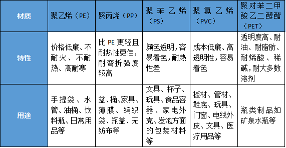 首先,我們對塑料的成分分類來做個簡單了解。到目前為止,已知的塑料材料有近一百多種,而被廣泛應用的有:聚乙烯(PE)、聚丙烯(PP)、聚氯乙烯(PVC)、聚苯乙烯(PS)、聚對苯二甲酸乙二醇酯(PET)。這些材料對非化學專業(yè)童鞋來說,乍一看可能會傻傻分不清,沒關系,看下圖。