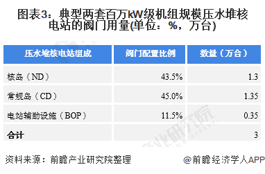 從中國核電機(jī)組的發(fā)展來看,核電閥門的需求量遠(yuǎn)高于同容量級(jí)的火電站。以容量為80萬千瓦的核電站為例,通徑DN25-1000mm的閥門需求量為8000-10000臺(tái),為同類火電站的2-3倍。一座有2套百萬kW級(jí)核電機(jī)組的核電站需各類閥門3萬臺(tái),其中核島(NI)用閥門1.3萬臺(tái),常規(guī)島(CI)用閥門1.35萬臺(tái),電站輔助設(shè)施(BOP)用閥門0.35萬臺(tái)。