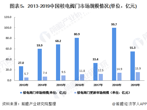 首先,按照單位萬千瓦造價(jià)1.6億元,測算出中國核電投資規(guī)模,然后,按照每年核電投資額中核電設(shè)備中的核島以及常規(guī)島中閥門占比測算核電閥門的市場規(guī)模。從測算的數(shù)據(jù)來看,中國的核電閥門市場規(guī)模中新增核電站閥門需求隨行就市,因?yàn)槠湫枨笠蕾囍袊穗娨约爸袕V核公司等公司本年度新增裝機(jī)容量的大小。而原有舊核電站的維修保養(yǎng)需求則是與已經(jīng)投入運(yùn)行中的核電站數(shù)量息息相關(guān),市場規(guī)模相對(duì)比較穩(wěn)定。2019年,中國核電閥門市場規(guī)模為55.3億元,其中核電閥門更新市場規(guī)模為15.9億元。