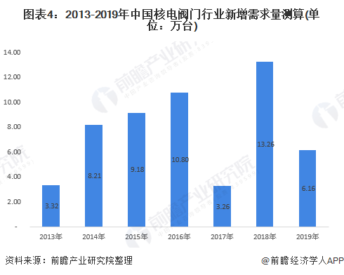 前瞻依照上述邏輯測算,2013年中國核電閥門需求量為3.32萬臺(tái),其中2018年為近年最高,達(dá)到13.26萬臺(tái)。通過數(shù)據(jù)發(fā)現(xiàn),核電閥門需求量與中國核電投資額的變化基本一致,這也說明核電閥門新增需求行業(yè)發(fā)展嚴(yán)重依賴上游核電公司。