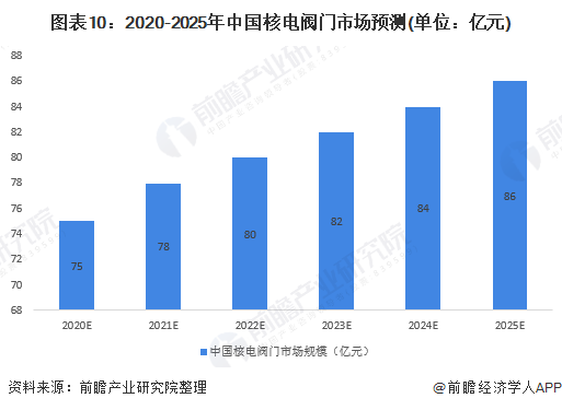 根據(jù)中國政府發(fā)布的十三五計(jì)劃和《中國能源中長期(2030~2050)發(fā)展戰(zhàn)略研究》,中國政府規(guī)劃以每年6-8座的速度新建核電站,并為引進(jìn)自主開發(fā)的新型核電站將投入共5000億元資金。依照過去十幾年中國核電建設(shè)速度來看,6-8座核電站(12-16個(gè)機(jī)組)顯然是不太現(xiàn)實(shí),前瞻假設(shè)以每年新建3座核電站計(jì)算,每座核電站裝配兩個(gè)機(jī)組(共6個(gè)機(jī)組),且每年3座核電站(6個(gè)機(jī)組)都在當(dāng)年年底之前投入運(yùn)營。通過對(duì)新增裝機(jī)部分需求和已運(yùn)營電機(jī)部分進(jìn)行計(jì)算,前瞻預(yù)測2025年中國核電閥門市場將會(huì)達(dá)到86億元。