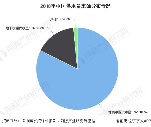 2018年地表水源供水量4952.7億m3,占供水總量的82.3%,地下水源供水量976.4億m3,占供水總量的16.2%,其他水源供水量86.4億m3,占供水總量的1.5%。