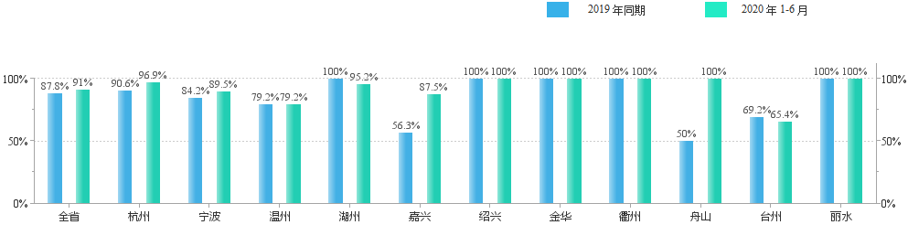 1至6月,全省地表水省控斷面I—III類水質(zhì)比例為91%,同比上升3.2個百分點。無劣V類水質(zhì)斷面。國家“水十條”考核斷面I—III類水質(zhì)比例為95.1%,同比上升0.9個百分點。全省交接斷面滿足功能要求比例為97.2%,同比上升2個百分點。全省縣級以上飲用水水源達標(biāo)率為100%,同比上升2.2個百分點。