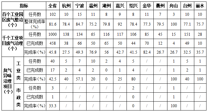 截至6月底,102個重點工業(yè)園區(qū)廢氣整治整體完成率為81.6%;全省已完成458個工業(yè)項目廢氣治理,完成率為45.8%;全省已完成17個工業(yè)類臭氣異味項目治理,完成率為42.5%。