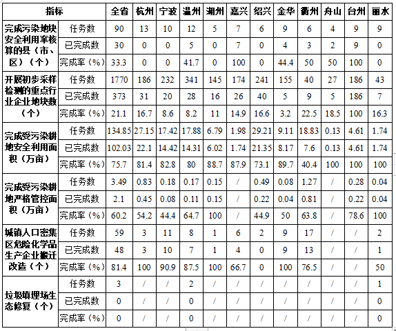 截至6月底,全省30個縣(市、區(qū))已完成污染地塊安全利用率核算工作,完成率為33.3%;全省已完成373個重點行業(yè)企業(yè)地塊采樣檢測,完成率為21.1%;全省已完成102.03萬畝受污染耕地安全利用,完成率為75.7%;全省已完成2.1萬畝受污染耕地嚴(yán)格管控,完成率為60.2%;全省已完成48家城鎮(zhèn)人口密集區(qū)危險化學(xué)品生產(chǎn)企業(yè)搬遷改造,完成率為81.4%。