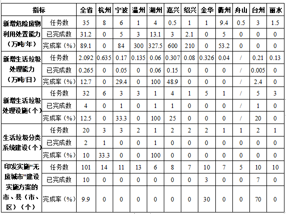 截至6月底,全省已完成新增危險廢物利用處置能力31.2萬噸/年,完成率為89.1%;全省已完成新增生活垃圾處理能力0.265萬噸/日,完成率為12.7%;全省已完成新增生活垃圾處理設(shè)施4個,完成率為12.5%;全省已完成生活垃圾分類系統(tǒng)建設(shè)2個,完成率為10%;全省已有10個市、縣(市、區(qū))印發(fā)實施“無廢城市”建設(shè)實施方案,完成率為9.9%。