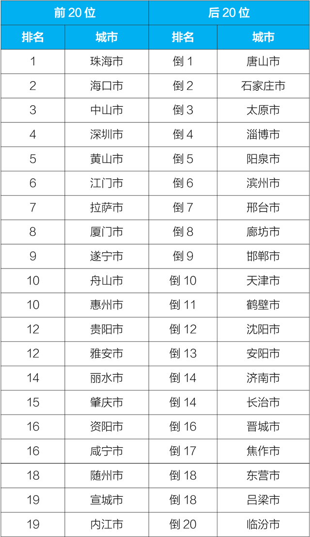 2020年7月168個(gè)重點(diǎn)城市環(huán)境空氣排名前20位和后20位城市名單