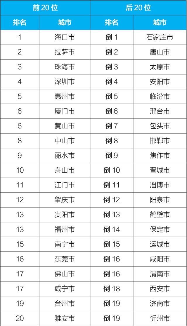 7月,168個(gè)重點(diǎn)城市中唐山、石家莊和太原市等城市空氣質(zhì)量相對(duì)較差(從倒數(shù)第1名至倒數(shù)第20名);珠海、??诤椭猩绞械瘸鞘锌諝赓|(zhì)量相對(duì)較好(從第1名至并列第19名,見附表5)。