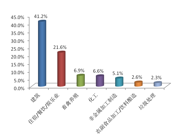 從行業(yè)類型來看,7月公眾反映最集中的行業(yè)為建筑業(yè),占41.2%,其次為住宿餐飲娛樂業(yè)和畜禽養(yǎng)殖業(yè),分別占21.6%和6.9%。其中,建筑業(yè)、住宿餐飲娛樂業(yè)舉報(bào)占比環(huán)比分別上升0.8個(gè)百分點(diǎn)和1.1個(gè)百分點(diǎn),畜禽養(yǎng)殖業(yè)舉報(bào)占比環(huán)比下降0.2個(gè)百分點(diǎn)。