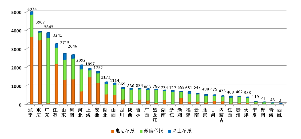 從各地區(qū)不同渠道舉報(bào)數(shù)量看,遼寧、重慶、廣東等地舉報(bào)總量居前,遼寧、重慶、上海等地電話舉報(bào)占比較高,廣東、陜西、浙江等地微信舉報(bào)占比較高。