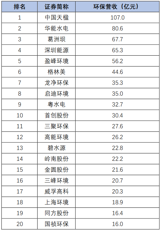 2020年上半年大氣污染防治A股環(huán)保上市公司環(huán)保營收TOP10