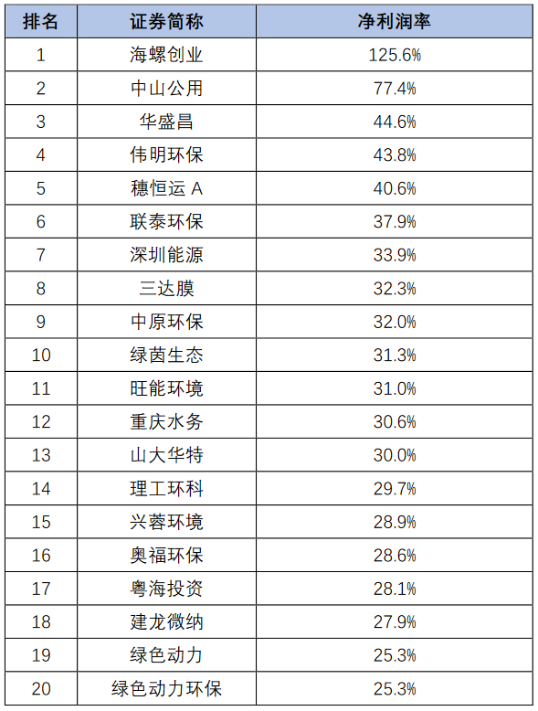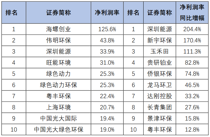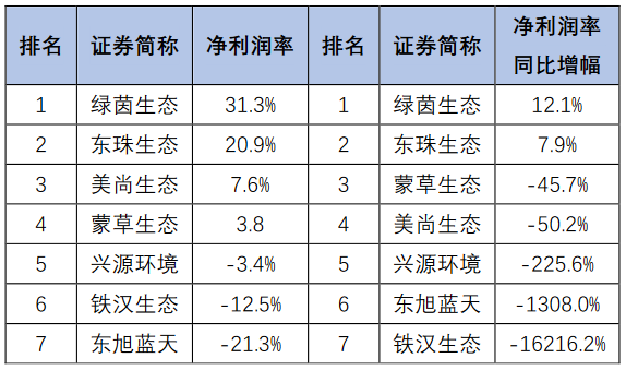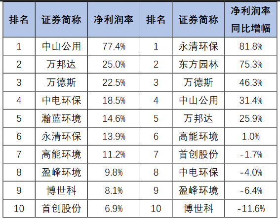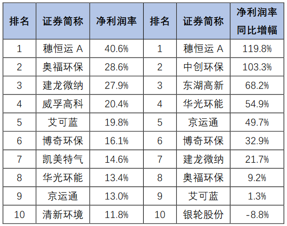2020年上半年大氣污染防治(A股+港股)環(huán)保上市公司凈利潤率及其同比增幅TOP10