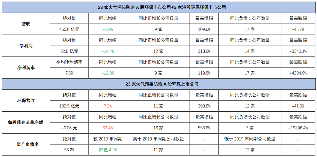 數據反映出:2020年上半年,《水污染防治行動計劃》考核節(jié)點臨近、“專項債+PPP”深度融合、污水處理廠提標改造及黑臭水體治理持續(xù)開展、重點流域水環(huán)境治理需求明確、污水資源化利用工作不斷推進,但因受新冠肺炎疫情影響,加之水污染防治PPP項目績效管控繼續(xù)強化、項目運營成本上升、公司在手項目推進不及預期,以及央企加速建設其內部水務工程團隊導致部分公司獲取外部PPP項目分包訂單的難度有所加大等,領域營收規(guī)模較2019年同期有所收縮,獲利表現及現金流情況均不及2019年同期。總體來看,2020年上半年大氣污染防治A股及港股環(huán)保上市公司營收總額同比小幅下降,A股環(huán)保上市公司環(huán)保營收總額同比增長;整體獲利能力不及上年同期,凈利潤總額和凈利潤率均同比下滑;現金流情況有所改善,負債水平下降。2020年上半年26家大氣污染防治環(huán)保上市公司主要業(yè)績指標