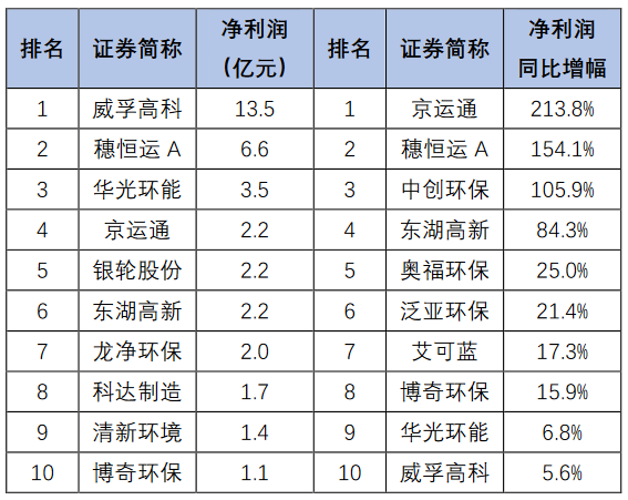 2020年上半年大氣污染防治(A股+港股)環(huán)保上市公司凈利潤及其同比增幅TOP10