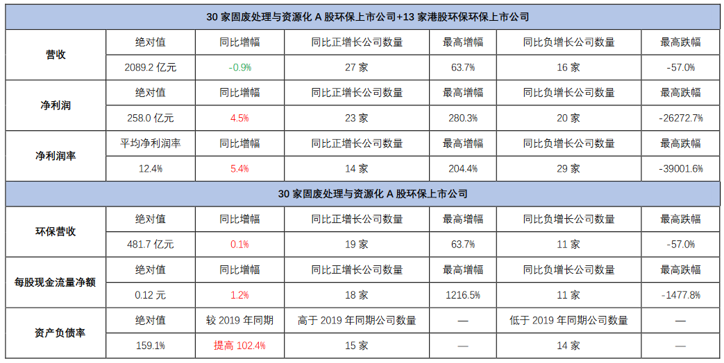 數據反映出:2020年上半年,工業(yè)企業(yè)的生產受到新冠肺炎疫情影響,疊加電力行業(yè)煙氣超低排放治理接近尾聲及非電市場尚未全面打開等多重影響,與工業(yè)企業(yè)聯系較為緊密的大氣污染防治領域的營收規(guī)模較2019年同期小幅萎縮,市場需求不振致環(huán)保上市公司盈利承壓,領域獲利表現不及2019年同期,隨著國內新冠肺炎疫情防控工作取得積極成效,工業(yè)企業(yè)有序復產,大氣污染防治市場逐步回暖,加之多數公司強化回款控制,領域環(huán)保營收規(guī)模有所擴大且現金流情況有所改善。總體來看,2020年上半年固廢處理與資源化A股及港股環(huán)保上市公司營收總額同比小幅下降,A股環(huán)保上市公司環(huán)保營收同比小幅增長;獲利能力優(yōu)于2019年同期,凈利潤總額和凈利潤率均同比增長;現金流情況有所改善,負債水平高于上年同期。2020年上半年43家固廢處理與資源化環(huán)保上市公司主要業(yè)績指標