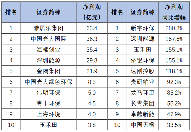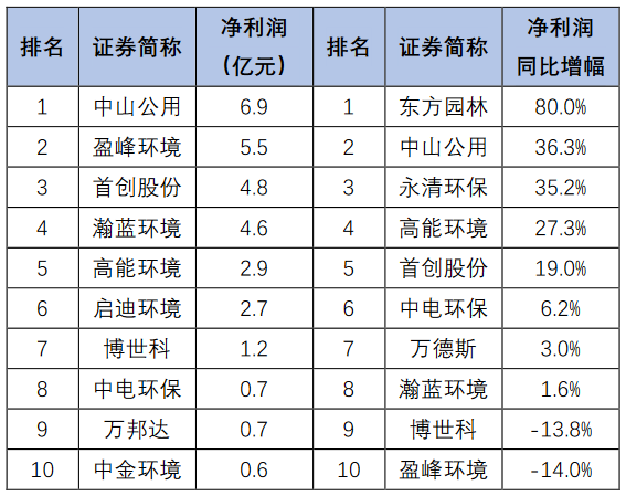 2020年上半年固廢處理與資源化(A股+港股)環(huán)保上市公司凈利潤及其同比增幅TOP10