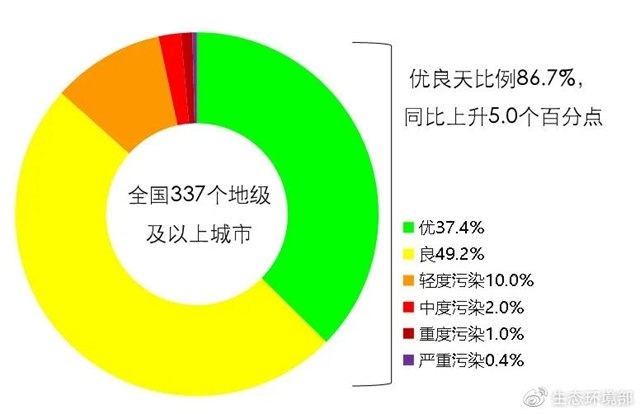 1-8月,全國337個地級及以上城市平均優(yōu)良天數(shù)比例為86.7%,同比上升5.0個百分點(diǎn);PM2.5濃度為31微克/立方米,同比下降11.4%;PM10濃度為53微克/立方米,同比下降13.1%;O3濃度為142微克/立方米,同比下降4.1%;SO2濃度為10微克/立方米,同比下降9.1%;NO2濃度為22微克/立方米,同比下降12.0%;CO濃度為1.3毫克/立方米,同比下降7.1%。