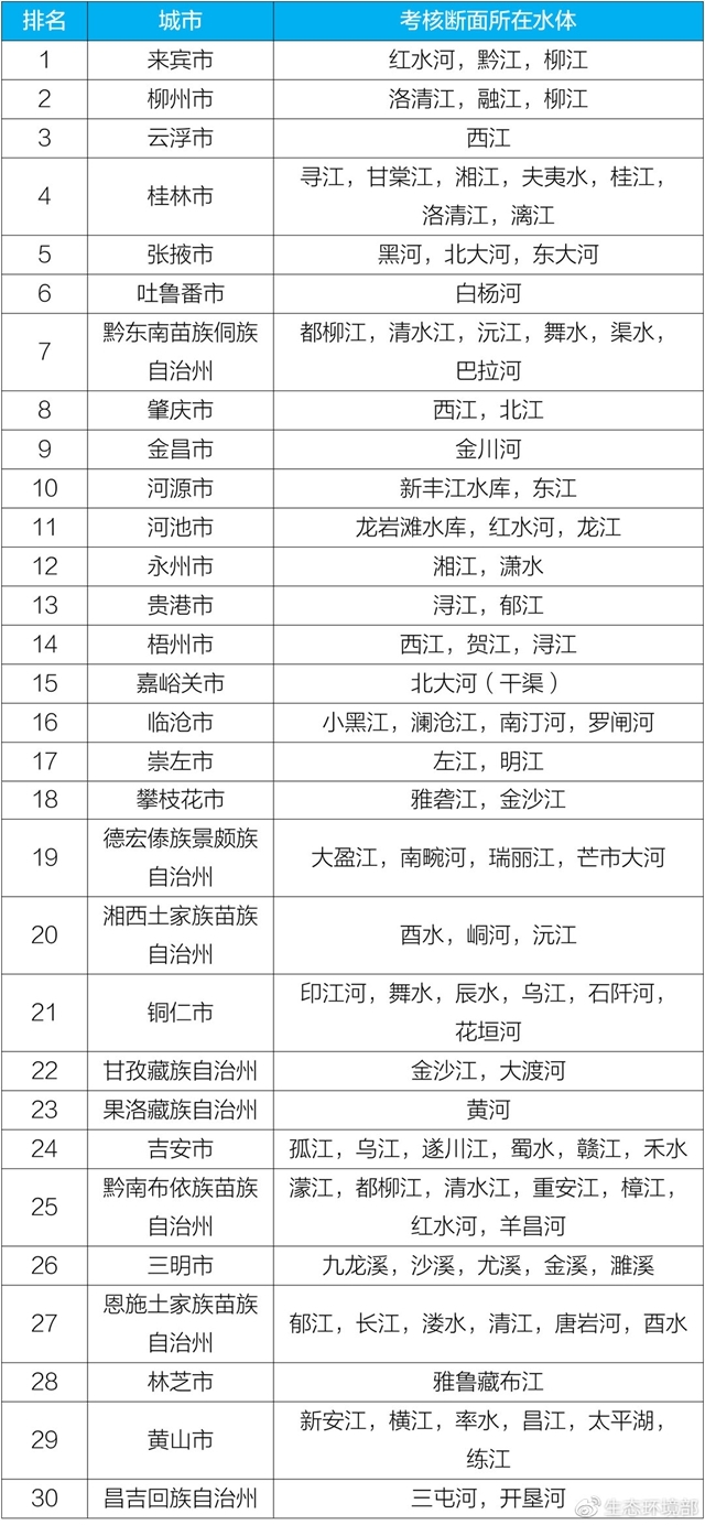 2020年1-8月國家地表水考核斷面水環(huán)境質(zhì)量狀況排名前30位城市及所在水體?