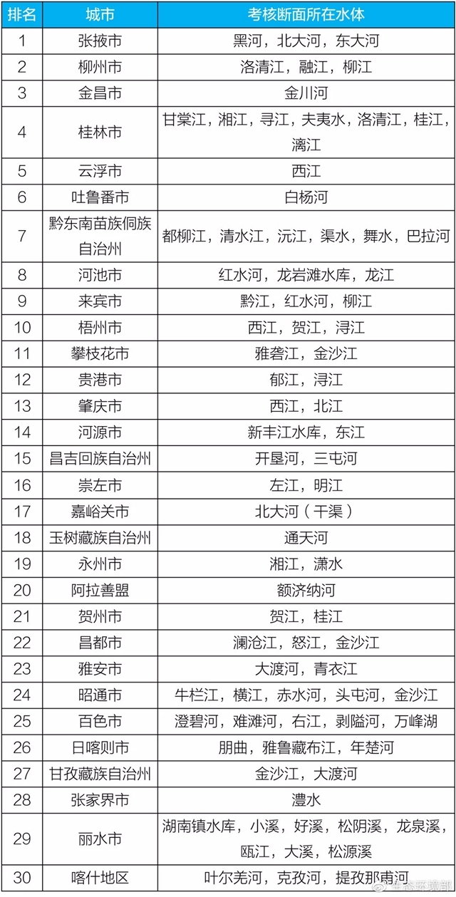 2020年8月國家地表水考核斷面水環(huán)境質(zhì)量狀況排名后30位城市及所在水體