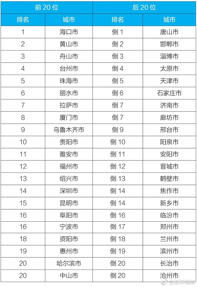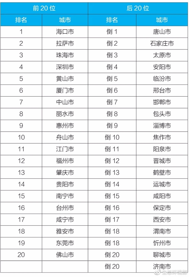 2020年8月168個重點(diǎn)城市環(huán)境空氣排名前20位和后20位城市名單?