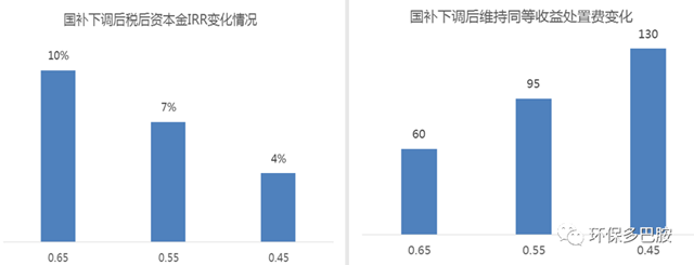 此次退補(bǔ),顯然將巨大影響項(xiàng)目收益。以一個(gè)1000噸/日項(xiàng)目為基準(zhǔn),按照補(bǔ)貼價(jià)60元/噸,0.65元/度補(bǔ)貼,其項(xiàng)目資本金稅后IRR為10.38%。如果國(guó)補(bǔ)取消0.1~0.2元,項(xiàng)目公司資本金稅后IRR將降低至4%~7%,顯然這無(wú)法滿足一般公司的投資需求。而若要維持同等收益,政府補(bǔ)貼需大幅上漲58%~116%(95元-130元/噸),一個(gè)項(xiàng)目政府每年需額外多付1100-2300萬(wàn)元。