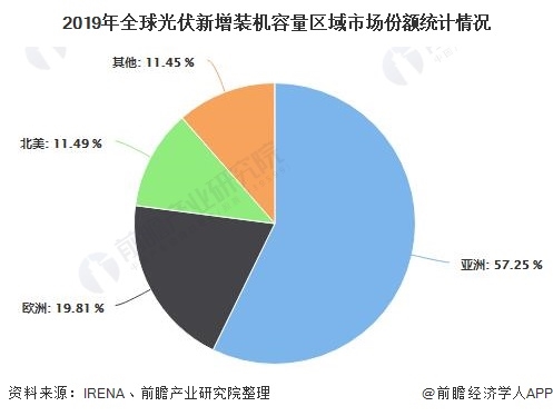 2019年全球光伏新增安裝容量市場(chǎng)份額主要來自于亞洲,亞洲新增安裝容量為55857MW,占比為57.25%。歐洲新增安裝容量為19332MW,占比為19.81%;北美新增安裝容量為11210MW,占比為11.49%。