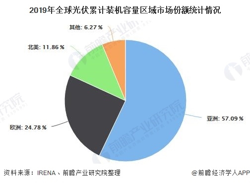 根據(jù)國際可再生能源機(jī)構(gòu)(IRENA)數(shù)據(jù)顯示,2019年全球光伏累計(jì)安裝容量市場(chǎng)份額主要來自于亞洲,亞洲累計(jì)安裝容量為330427MW,占比為57.09%。歐洲累計(jì)安裝容量為138539MW,占比為24.78%;北美累計(jì)安裝容量為68276MW,占比為11.86%。