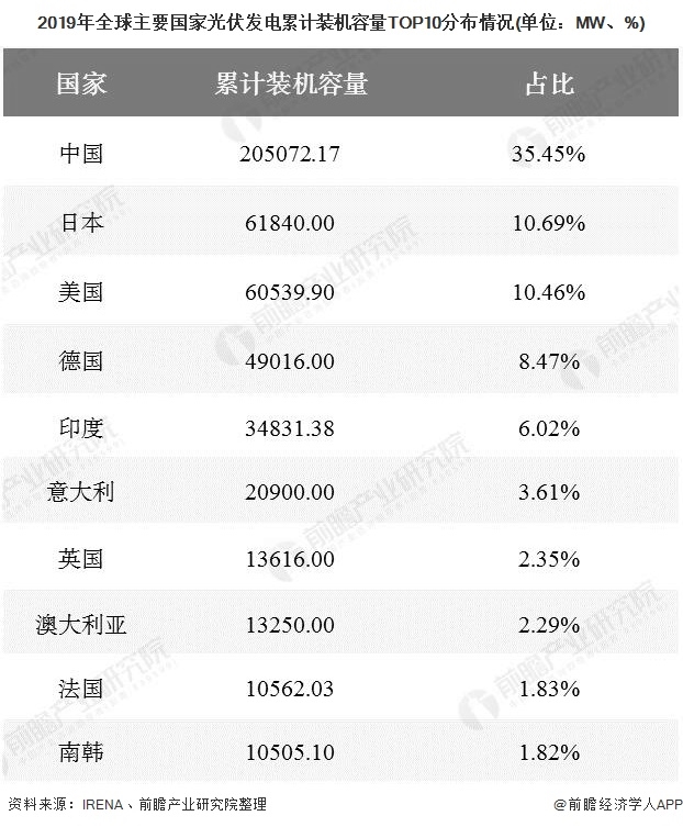 根據(jù)國際可再生能源機(jī)構(gòu)(IRENA)數(shù)據(jù)顯示,從國家來看,2019年世界主要光伏發(fā)電國家累計(jì)裝機(jī)容量中前三分別為:中國、日本、美國。合計(jì)占比達(dá)到56.6%,其中中國占全球比重為35.45%。