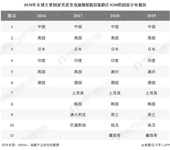 根據(jù)國際可再生能源機(jī)構(gòu)(IRENA)數(shù)據(jù)顯示,2019年全球主要光伏發(fā)電國家新增光伏裝機(jī)容量超過1GW的國家有11個(gè),較2016年增加5個(gè)。