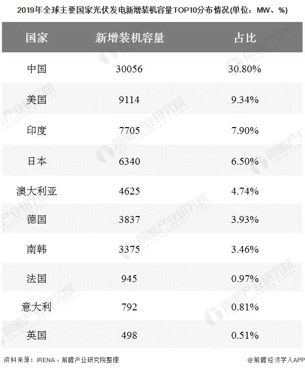 從國家來看,2019年世界主要光伏發(fā)電國家新增裝機(jī)容量中前三分別為:中國、美國、印度,其中中國新增裝機(jī)容量為30056MW,占2019年全球新增裝機(jī)容量比重為30.80%。
