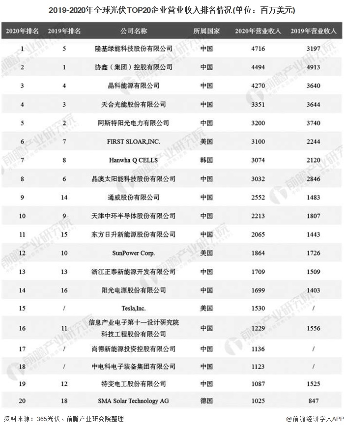 根據(jù)365光伏發(fā)布的“2020全球光伏企業(yè)20強(qiáng)排行榜”榜單顯示,隆基綠能科技股份有限公司、協(xié)鑫(集團(tuán))控股有限公司、晶科能源有限公司、天合光能股份有限公司、阿斯特陽光電力有限公司、FIRST SLOAR,INC.、Hanwha Q CELLS、晶澳太陽能科技股份有限公司、通威股份有限公司、天津中環(huán)半導(dǎo)體股份有限公司進(jìn)入前十。中國企業(yè)已經(jīng)連續(xù)兩年占據(jù)榜單前五強(qiáng),其中,隆基綠能科技股份有限公司以營(yíng)收4716百萬美元位居榜首。