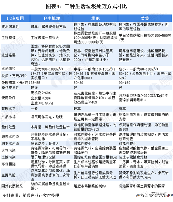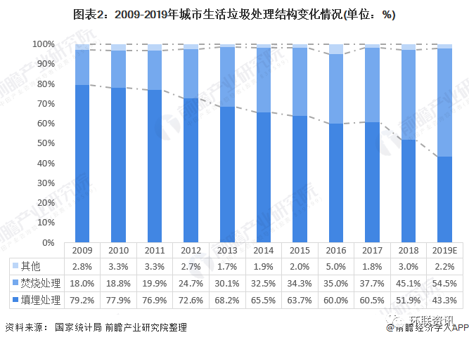 注:生態(tài)環(huán)境部尚未發(fā)布2019年數(shù)據(jù),以上數(shù)據(jù)為前瞻根據(jù)行業(yè)歷年增速測算而來,屆時以官方公布數(shù)據(jù)為準(zhǔn)。我國的垃圾處理呈現(xiàn)出以衛(wèi)生填埋為主、焚燒處理提升和堆肥處理衰退的特點,從2018年我國固廢處理廠、固體廢物處理能力和固廢處理量的分布來看,衛(wèi)生填埋占所有垃圾處理方式的50%左右,但由于用地緊張和二次污染,填埋已經(jīng)出現(xiàn)瓶頸。尤其在我國東部等一些經(jīng)濟發(fā)達省份,人口密度大,這決定了未來在這些地區(qū),垃圾焚燒將逐漸成為垃圾處理的主要方式,2018年占比已逐步提高到45%左右,2019年隨著垃圾焚燒發(fā)電項目的投產(chǎn),預(yù)計焚燒處理率將達54.5%左右。