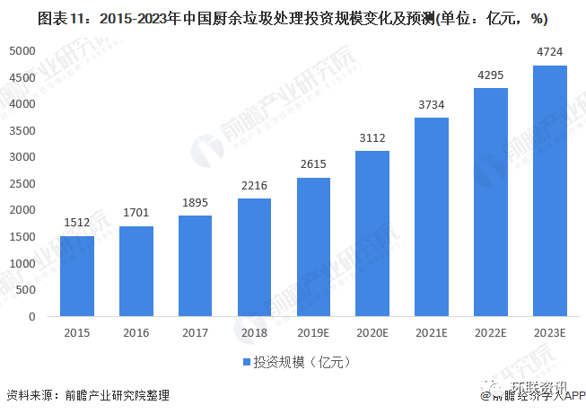 得益于中國對環(huán)保行業(yè)投資的持續(xù)提升、公眾環(huán)保意識增強、廚余垃圾處理比例提高,中國廚余垃圾處理行業(yè)市場規(guī)模(以項目投資額統(tǒng)計)在過去五年間基本呈現(xiàn)上升態(tài)勢。廚余垃圾處理行業(yè)市場在2015-2018年間迅速發(fā)展,由1344億元上升至2216億元,年復(fù)合增長率超過13%。未來五年,受餐飲行業(yè)高速發(fā)展驅(qū)動及未來“十四五”規(guī)劃影響,中國廚余垃圾處理行業(yè)市場將保持穩(wěn)定增長。按照國家規(guī)劃估計,預(yù)計廚余垃圾處理行業(yè)市場規(guī)模將在2019年至2023年基本保持現(xiàn)有發(fā)展速度,于2023年達到4724億元人民幣,年復(fù)合增長率約為16%。