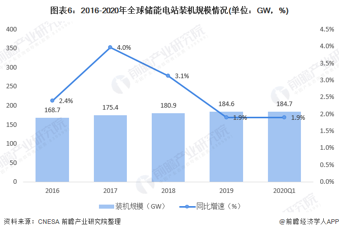 截至2020年3月底,全球已投運(yùn)電力儲(chǔ)能項(xiàng)目(含物理儲(chǔ)能、電化學(xué)儲(chǔ)能以及熔融鹽儲(chǔ)熱)的累計(jì)裝機(jī)規(guī)模達(dá)184.7GW,同比增長(zhǎng)1.9%。