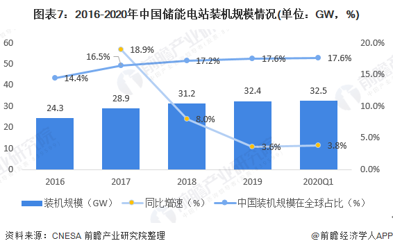 2016-2019年,中國(guó)儲(chǔ)能電站行業(yè)整體呈穩(wěn)步上升的趨勢(shì),儲(chǔ)能電站裝機(jī)規(guī)模從2016年的24.3GW上升至2019年的32.4GW。根據(jù)CNESA于2020年6月3日發(fā)布的《儲(chǔ)能產(chǎn)業(yè)研究白皮書(shū)2020》數(shù)據(jù),截至2019年底,中國(guó)已投運(yùn)儲(chǔ)能項(xiàng)目累計(jì)裝機(jī)規(guī)模32.4GW,占全球市場(chǎng)總規(guī)模的17.6%,同比增長(zhǎng)3.6%。