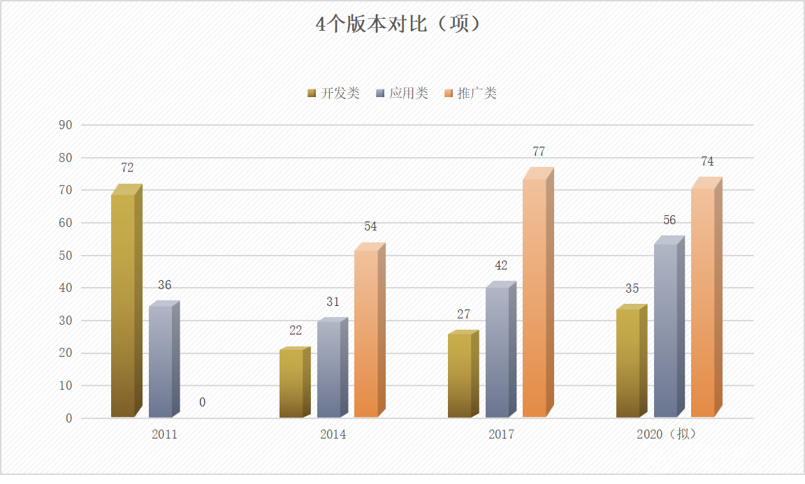 很顯然,應(yīng)用推廣類占比很高,尤其是推廣類。而縱觀2011、2014、2017版本,情況也都差不多。值得注意的是,2011版開發(fā)類項目比后面幾個版本都要多得多。
