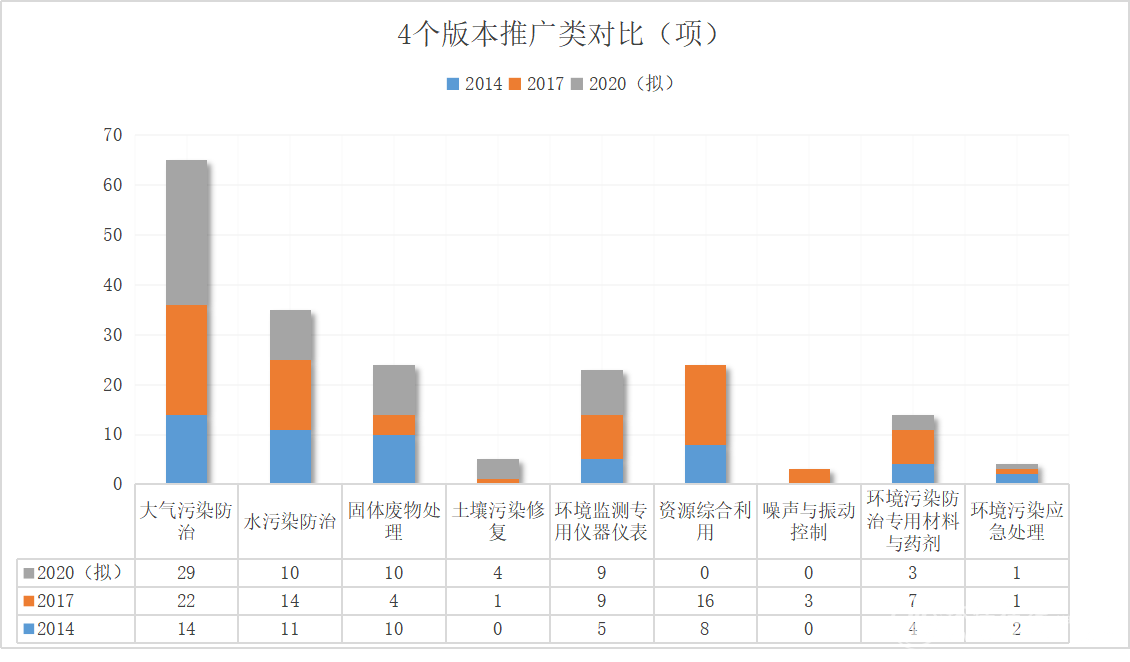 2011版,以及2014的各類鼓勵發(fā)展的技術(shù)相對較為均衡,2017年可見在資源綜合利用上的傾斜較為明顯,2020年征求意見稿中則偏向于水污染防治。