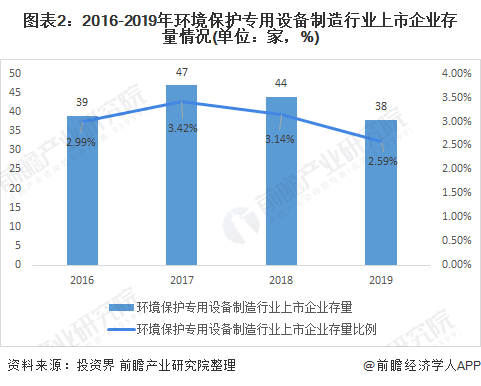 從環(huán)境保護(hù)專用設(shè)備制造行業(yè)上市企業(yè)存量及其占比來看,2017-2019年其上市企業(yè)存量占規(guī)模以上總企業(yè)數(shù)的百分比逐年減少,2019年比例下降至2.59%。
