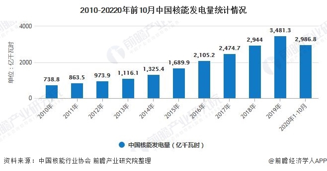 隨著我國核電項(xiàng)目陸續(xù)完工投產(chǎn),核電應(yīng)用進(jìn)一步推廣,我國核電發(fā)電量保持增長的趨勢。2019年,我國核能發(fā)電量為3481.31億千瓦時(shí),同比增長18.09%。截止至2020年1-10月中國核能發(fā)電量產(chǎn)量累計(jì)達(dá)到2986.8億千瓦時(shí),累計(jì)增長5.7%。