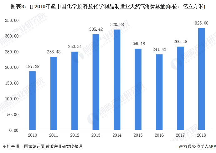 2010-2018年,我國化學原料及化學制品制造業(yè)天然氣消費總量呈現(xiàn)波動狀態(tài)。2010年,我國天然氣化工消費量為187.28億立方米,2014年上升至320.28億立方米。受煤炭價格大幅走低的影響,近年來天然氣化工消費量增長乏力。2018年,我國化學原料及化學制品制造業(yè)天然氣消費總量為325億立方米。