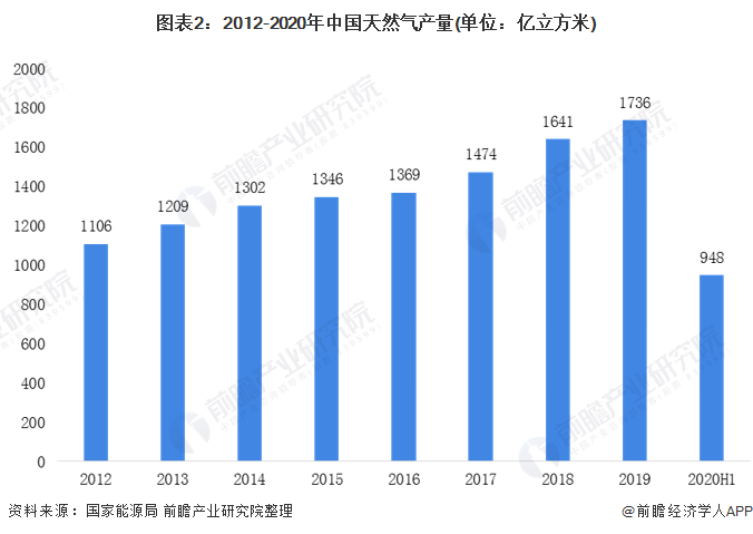 2012-2019年,中國天然氣產(chǎn)量逐年遞增,增速波動變化。根據(jù)國家統(tǒng)計局數(shù)據(jù),2019年,中國天然氣產(chǎn)量為1736.2億立方米,較上年同期增長了5.8%,增速在經(jīng)過了三年上升后開始下降。2020年上半年中國天然氣勘探力度基本不變而產(chǎn)量繼續(xù)強勁增長,天然氣產(chǎn)量為948.3億立方米,同比增長7.91%。