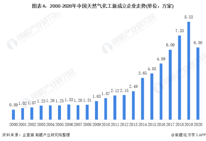從新成立企業(yè)數(shù)來看,2000-2020年中國天然氣化工新成立企業(yè)呈現(xiàn)逐年上升趨勢。自2013年起,中國天然氣化工新成立企業(yè)出現(xiàn)爆發(fā)式增長;在2019年達到了峰值8.53萬家。2020年,中國天然氣化工新成立企業(yè)有6.3萬家。